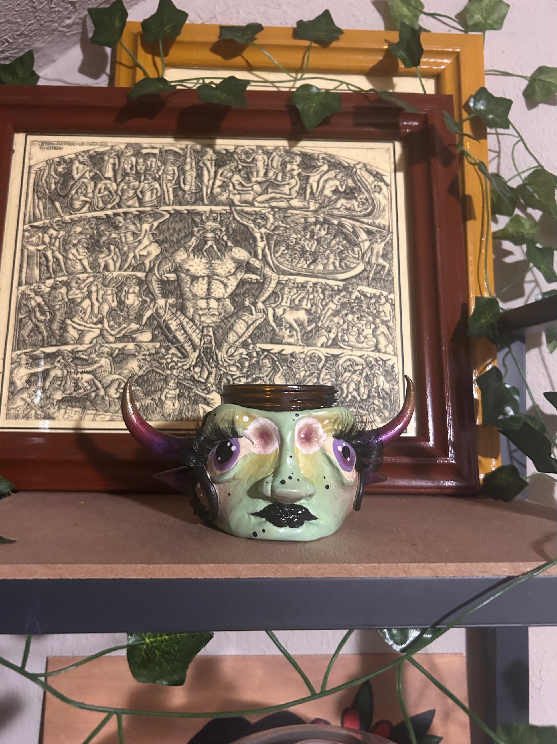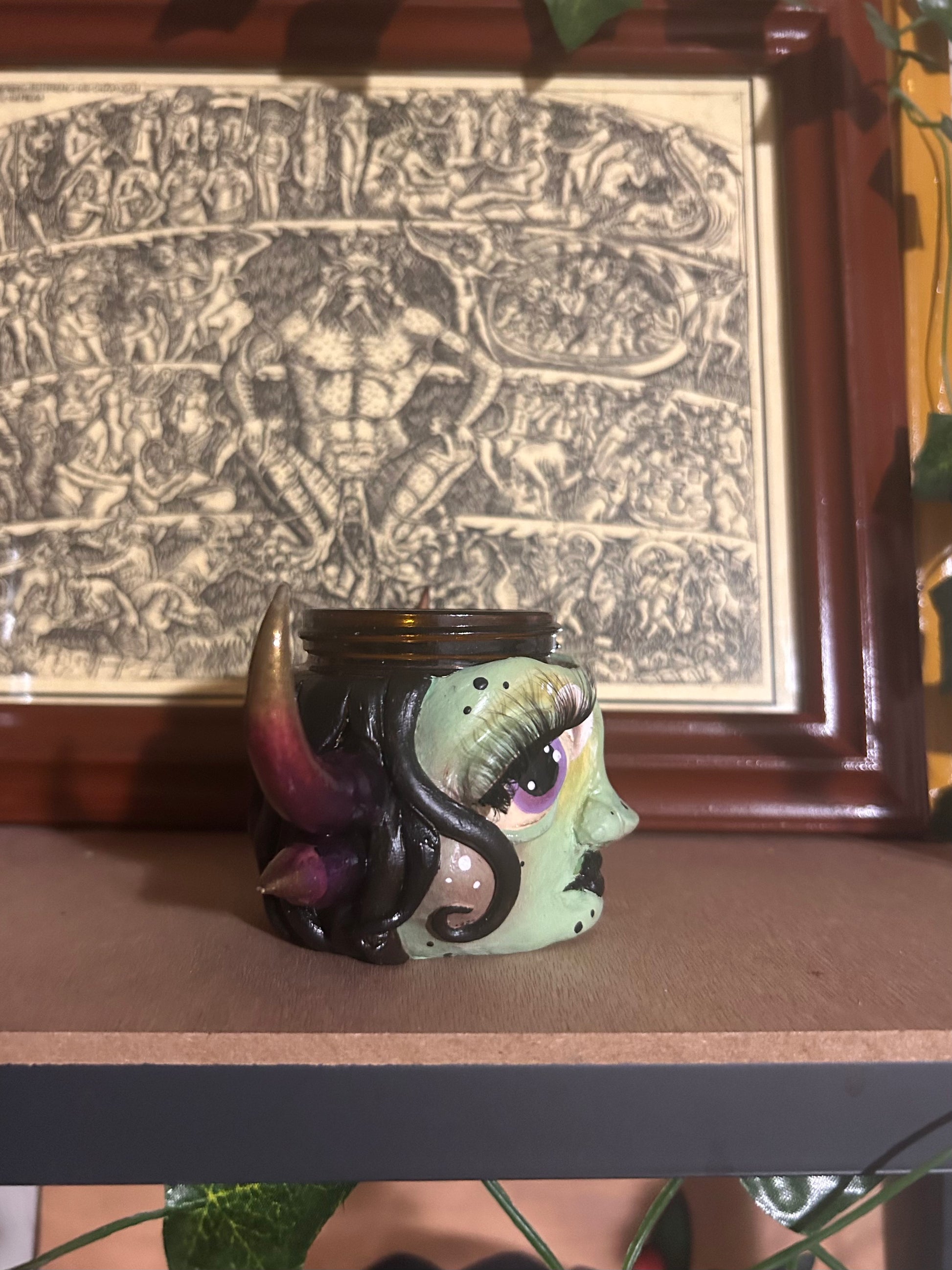 Bellatrix was made by sculpting polymer clay to a glass jar, painting with acrylic, sealing, and finishing with eyelashes. They are 4oz and come with a lid.
