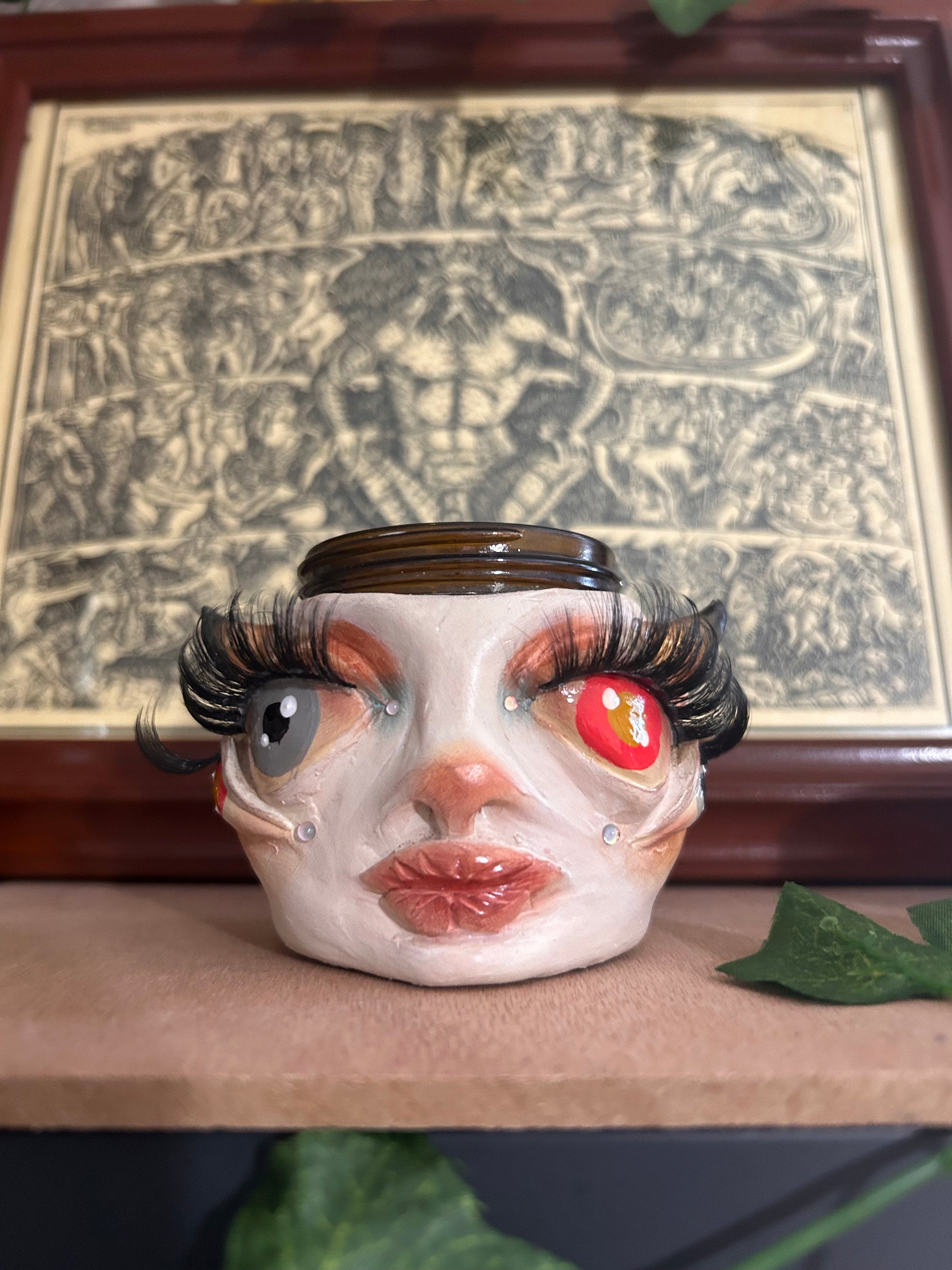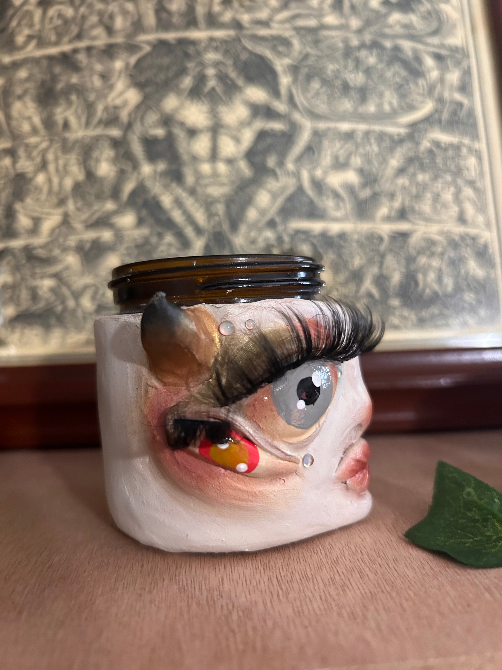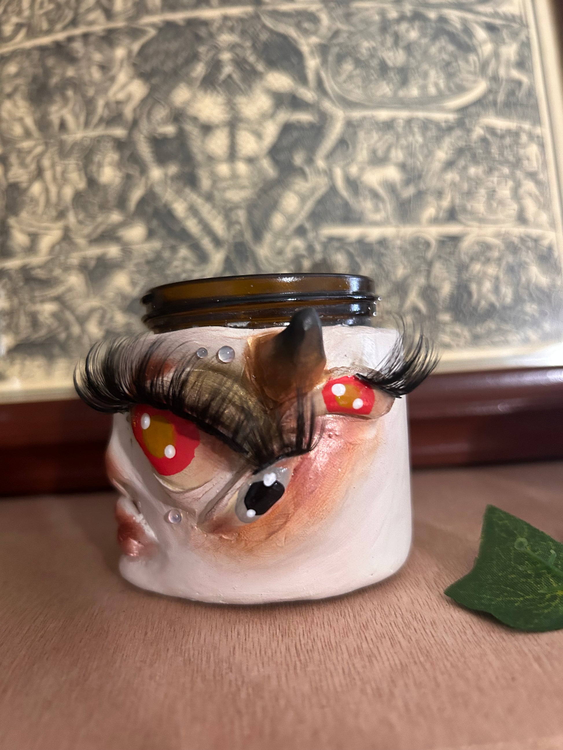 This is the Ciaran Jarhed! Theyre made with polymer clay sculpted to a glass jar, painted with acrylic paint, sealed, and finished with eyelashes! They come with a lid.