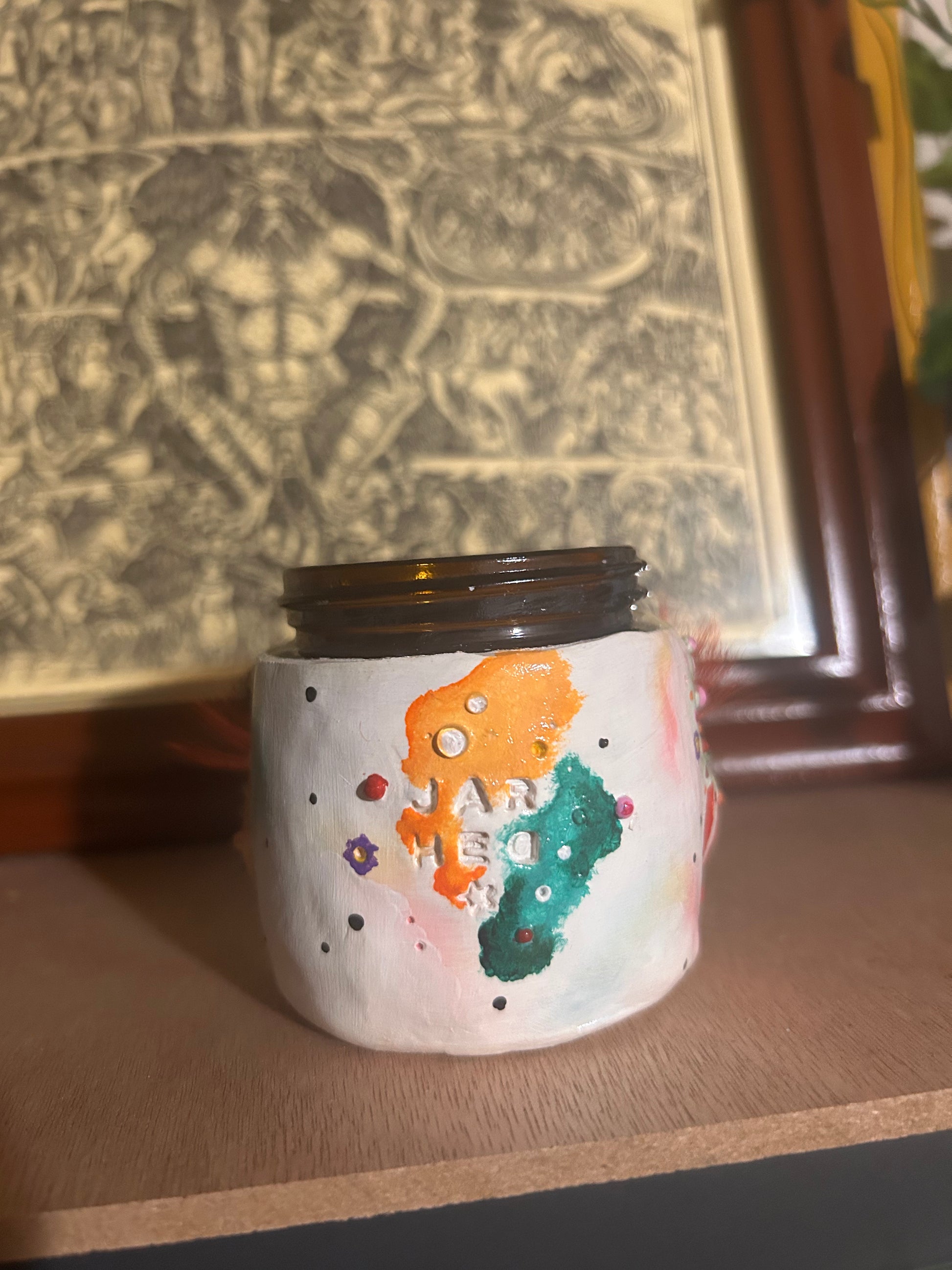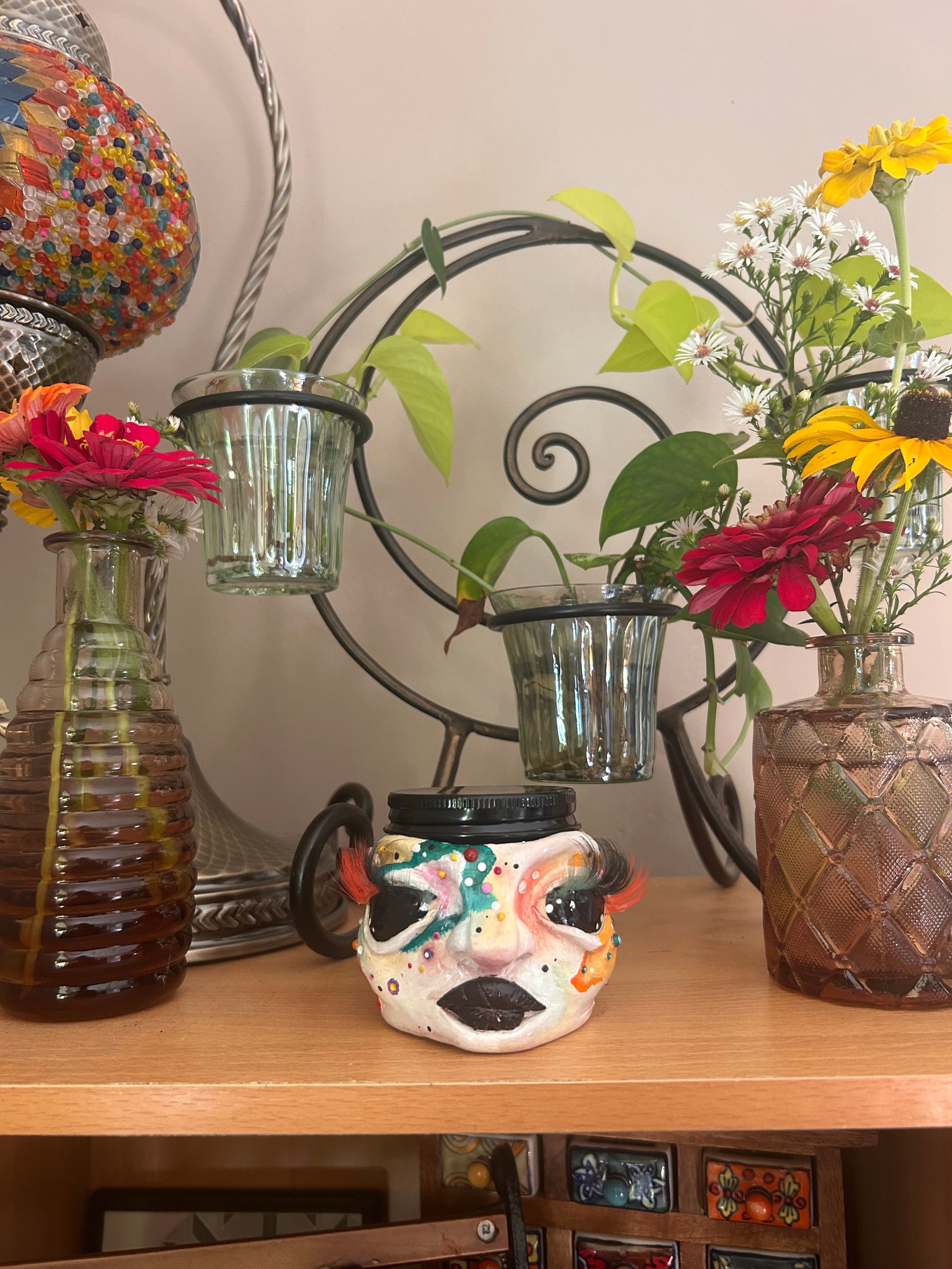 The Colorful Mold Jarhed was made by sculpting polymer clay to a glass jar, painting with acrylic, sealing, and finishing with eyelashes. They are 4oz and come with a lid.