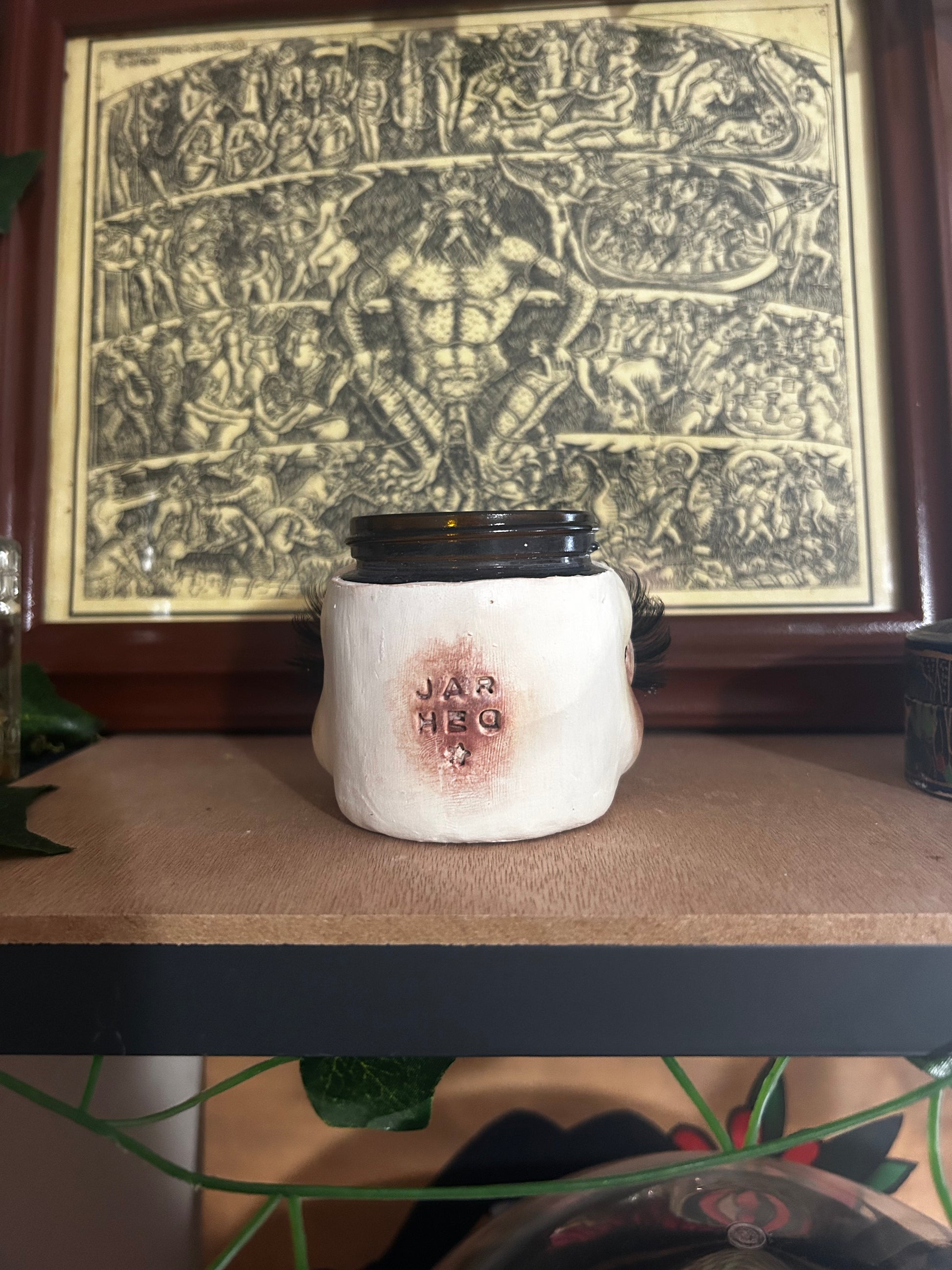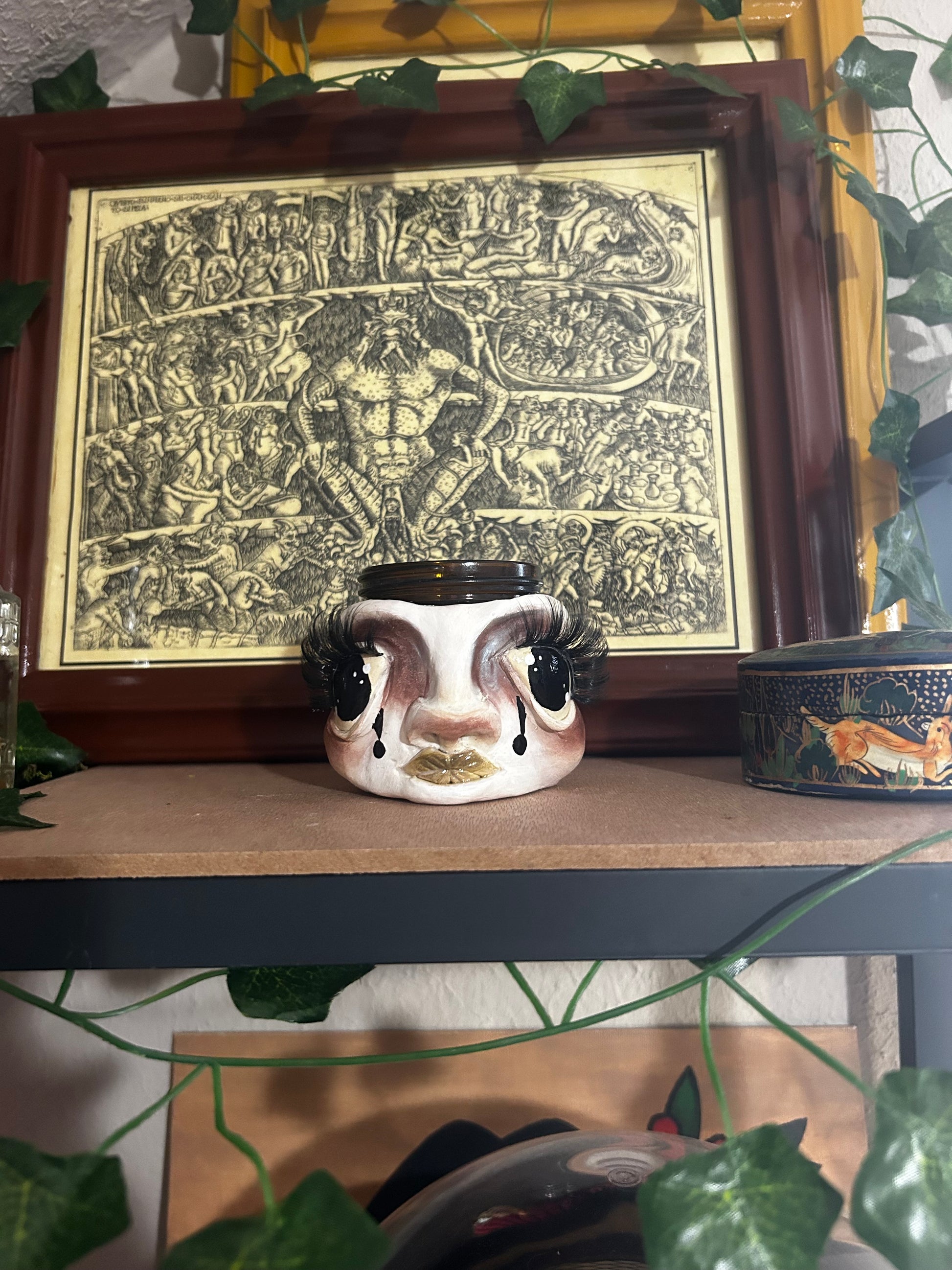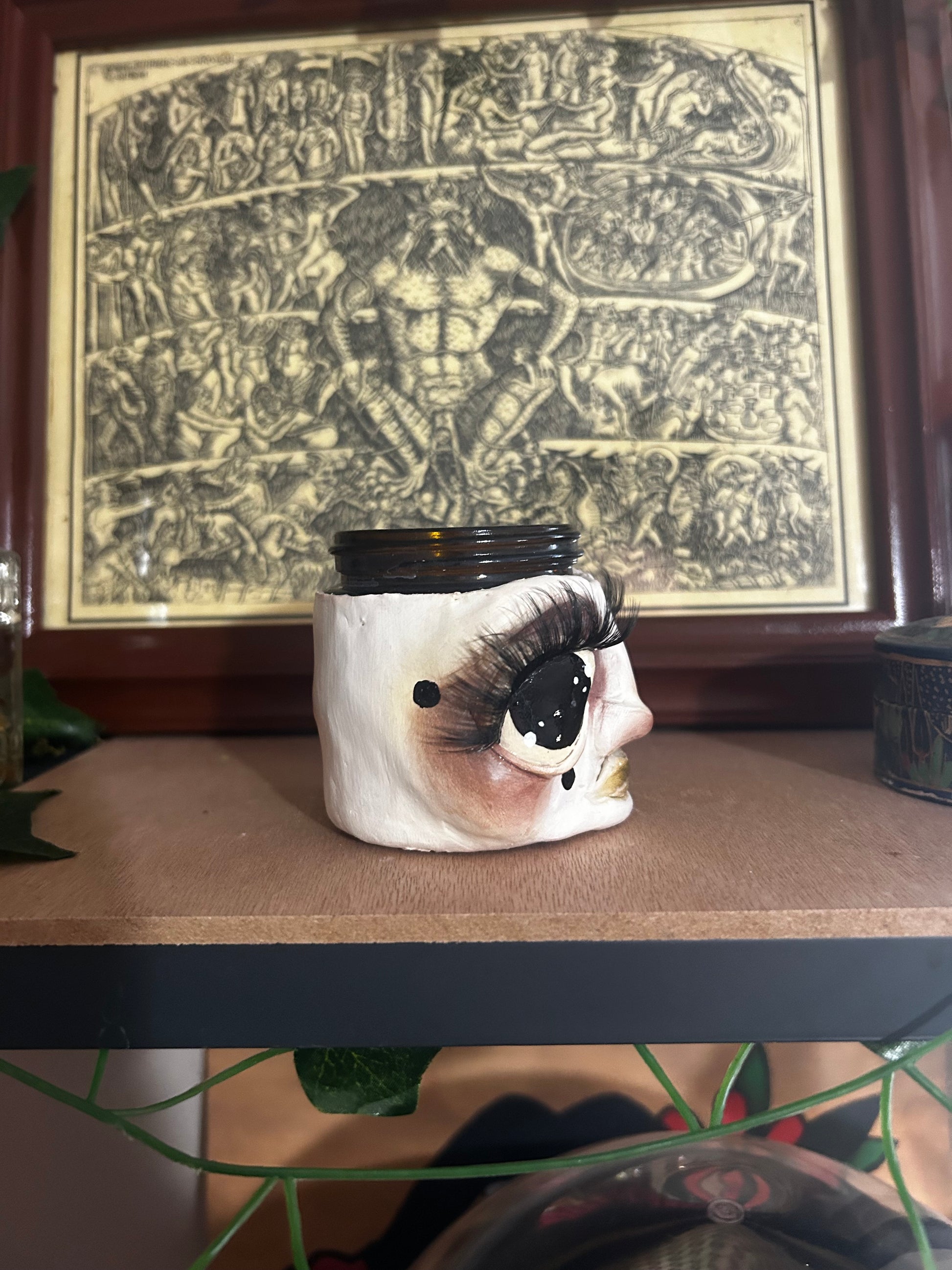 Hand sculpted polymer clay to a 4oz glass jar, painted with acrylic paint, sealed, and finished with eyelashes. She comes with a lid.